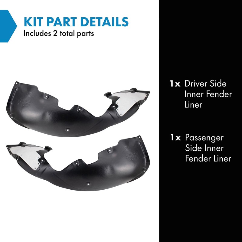 2 Piece Inner Fender Liner SetKit Includes(1) Driver Side Inner Fender Liner(1) Passenger Side Inner Fender LinerFitmentCompatible with: 2017-18 Hyundai Elantra US Built Models 1st VIN Digit 1 Driver & Passenger SideProduct AttributesQuantity: 2 PieceReference NumbersHyundai: 86811-F3000, 86812-F3000Partslink Numbering System: HY1248159, HY1249159