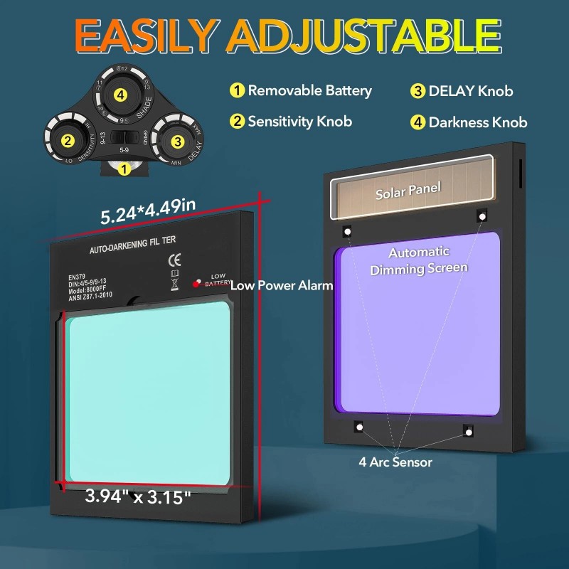 【Long-lasting and durable welding helmet】 This auto darkening welding helmet is made of high-quality PP material, which is impact-resistant, flame-resistant and tough. The welder helmet complies with ANSI Z87.1/ EN379 CE/ CSA Z94.3 standards. This true color welding helmet uses solar cells and CR2450 replaceable lithium batteries. The solar cells can absorb the strong light energy caused by the electric arc, thus extending the battery life. The lithium battery is replaceable.