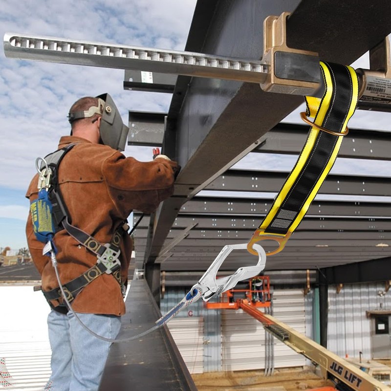 - STURDY: Our Fall Protection Beam Strap is crafted from pure, non-recycled synthetic material, offering exceptional strength, resilience to aging, abrasion, and heat, with a high tensile strength exceeding 22 KN. It features reinforced webbing on the back for added protection and boasts a large D-ring along with a standard size D-ring for pass-thru, enhancing length adjustment versatility. Material: Alloy Steel; Breaking Strength: 5000 lbs.