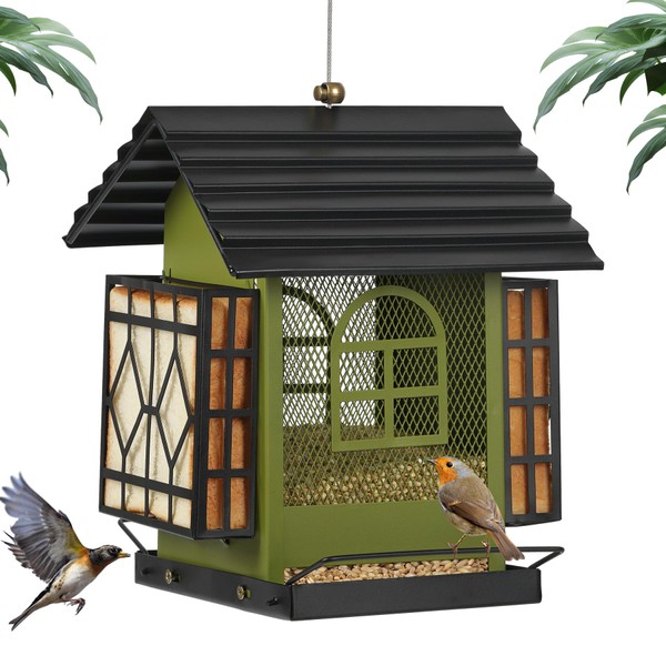 - Easy to Clean & Fill : The removable top cover and large opening make this outdoor bird feeder easy to fill with seed, there is a feeding window on the left side and one on the right side, just open the window to fill with bird food, cleaning the outdoor hanging bird feeder is even easier, just gently remove the cover and rinse it directly with water!