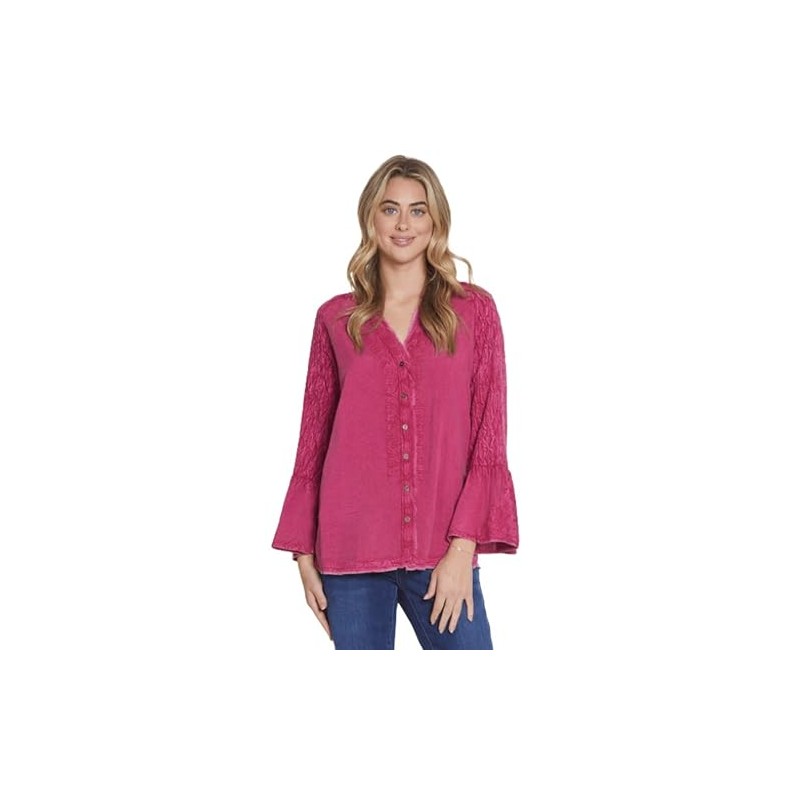 Tru Luxe Jeans Women's Button Front Top with Sleeve Smocking and Embroidery, Fuchsia