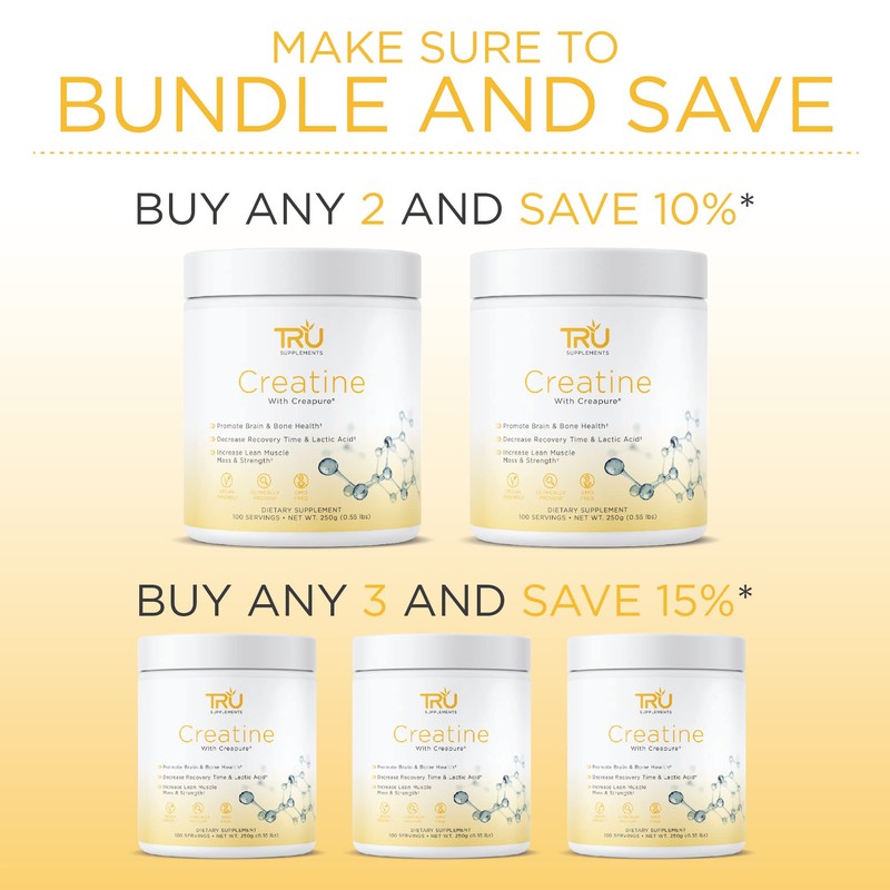 TRU Supplements Creatine is our additive free Creapure formula. Creatine is a molecule that is naturally present in the human body, especially in the skeletal muscles. Any one who is exercising regularly should consider creatine supplementation to increase strength and endurance.INCREASE STRENGTH & ENDURANCE Creatine is essential in the process of producing ATP, the fuel our bodies operate with. Supplementation with Creapure has been shown to increase strength & endurance by 30% as well as reduce muscle lactate accumulation by 70%.Boost Brain & Bone Health Creapure has been shown to increase mental performance and acuity. Additionally, daily supplementation with Creapure can lead to an increase in bone density.100 servings per container while each serving contains 2.5 grams of Creapure, Creatine Monohydrate which is one of the most pure forms developed and most widely used in clinical studies