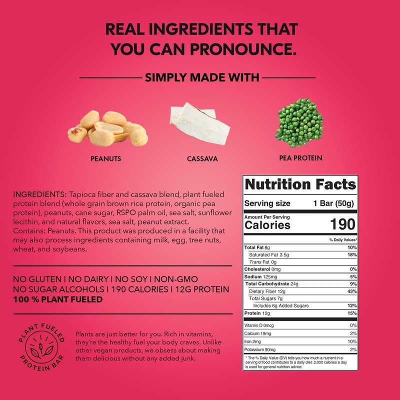- ENJOY GUILT-FREE INDULGENCE: Indulge in healthy delight with our Get In My Belly Pb & Jelly protein bars crafted with recognizable ingredients like Peanuts, Cassava, and Pea Protein. Free from gluten, dairy, and soy; no GMOs or sugar alcohols involved. Each bar is a powerhouse of nutrition with 12g of lean, plant protein, just 190 calories, and zero trans fats. Plus, with 12g of dietary fiber and essential minerals, it's a scrumptious snack that's as nutritious as it is delicious. Fuel your day the plant based way!