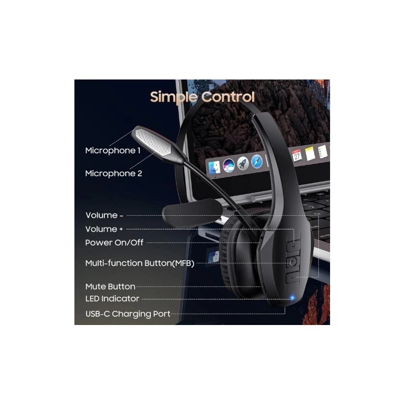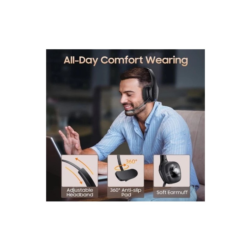 - All-Day Comfort for Prolonged Wear: Crafted with soft, breathable earmuffs and an ultra-soft adjustable headband, our bluetooth headset features a 270° rotatable design for both earmuffs and microphone, ensuring prolonged comfort and easy to switch and left/right ear available. Ideal for extended use, this wireless headset is perfect for work, promising day-long comfort.