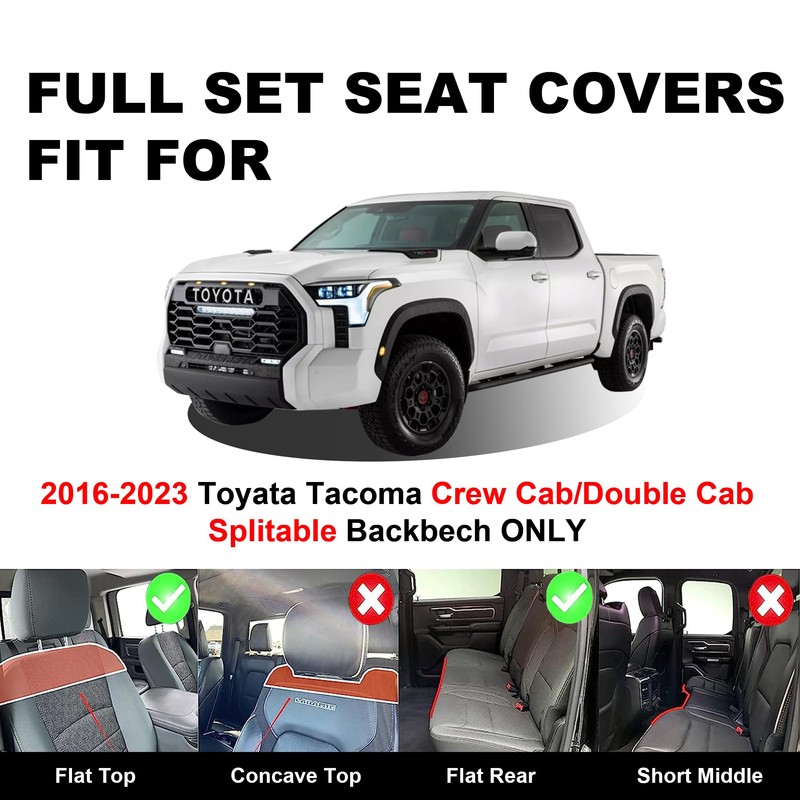 - 【CUSTOMIZED TACOMA SEAT COVERS】 2 piece front seat covers/1 piece back seat cover/5-piece seat covers full set are customized specifically for 2016-2023 Tacoma Regular Cab/Double Cab/Crew Cab including SR, SR5, TRD Pro, TRD Sport, TRD Off-Road, Limited. Our car seat cover do not fit Tacoma extended/access cab. Rear 60/40 split bench seat covers are independently covered, which means you can seamlessly fold each section without exposing, giving your car's interior a new look.