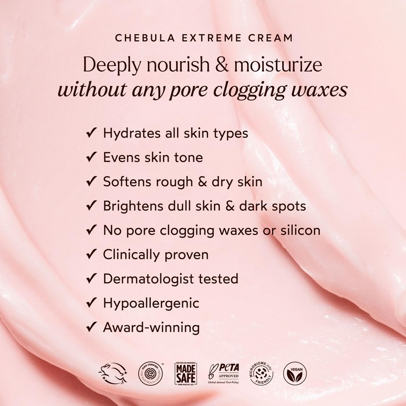 - Introducing Chebula Extreme Cream, the powerful, pink goop thats clinically proven to transform your skin. This unique moisturizer is free of pore-clogging waxes, allowing its potent anti-aging ingredients to penetrate deeply. Powered by Chebula, a revolutionary antioxidant targeting five signs of aging, it nourishes, moisturizes, and strengthens the skin barrier. Enjoy soft, dewy skin with this award-winning formula, recognized by Oprah Daily and Elle Beauty. Experience the difference with Chebula Extreme Creamyour key to radiant, youthful skin.