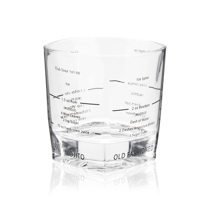 - 8.5 OZ COCKTAIL MEASURING CUPS - This glassware set is made of clear glass with a sturdy base. Each glass has four sides printed with recipes and holds 8.5 oz— perfect for an Old Fashioned, Negronis, or Scotch on the rocks.