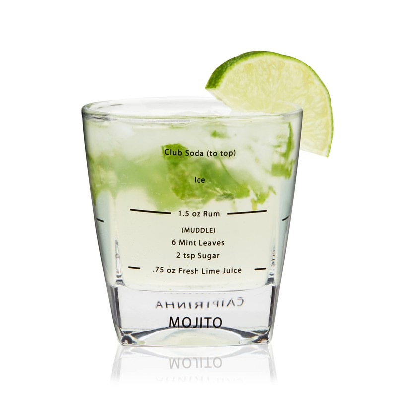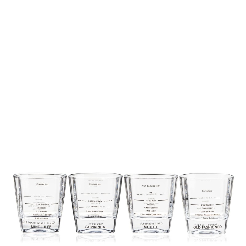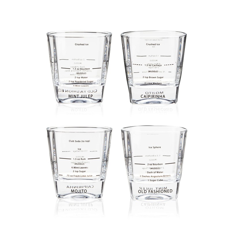 - COCKTAIL RECIPE GLASSES - These four sided recipe glasses include recipes for four cocktails. Ingredients, alcohol ratios, and instructions are included for Old Fashioneds, Mojitos, Caipirinhas, and Mint Juleps so you’ll never have to look them up.