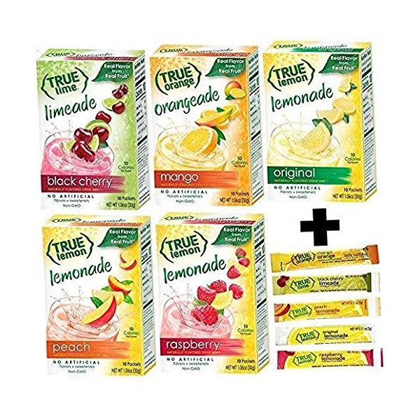 True Lemon Assorted Beverage Pack: (5boxes 10ct each) with 5 FREE BONUS Sticks of Lemonade! True Lemon Original True Peach Lemonade, True Black Cherry Limeade, True Mango Orange and True Raspberry Assorted True Lemonade Drink Mixes.