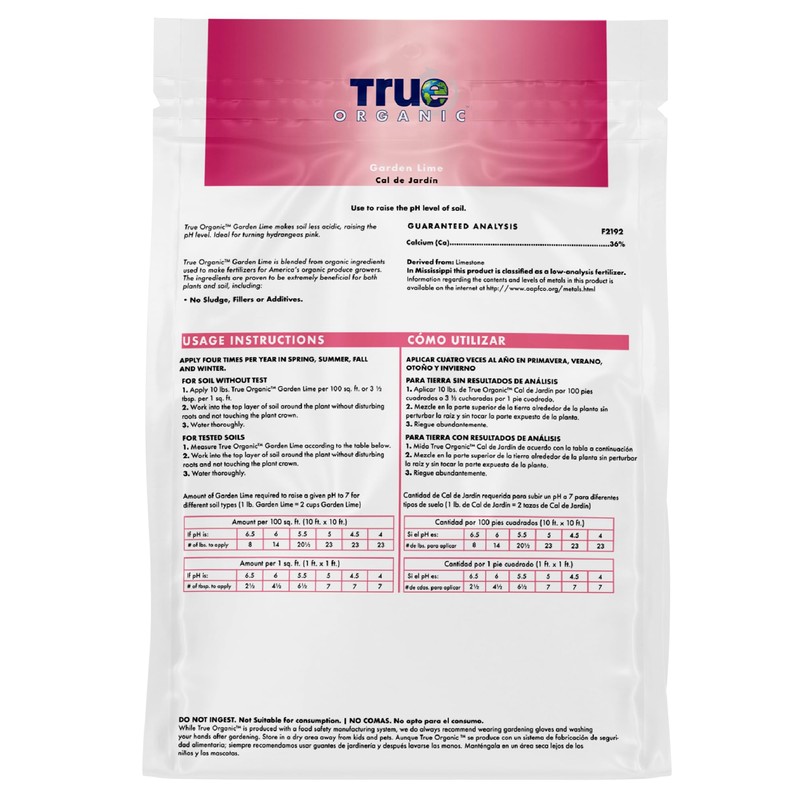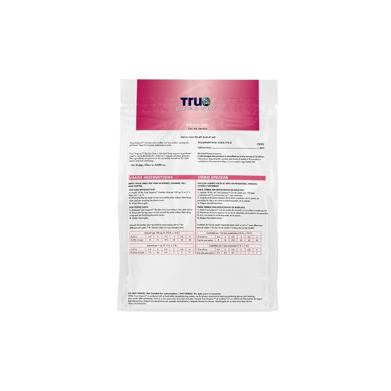 True Organic? Garden Lime is a high-quality soil amendment that helps balance the pH levels of acidic soil, making it ideal for gardeners looking to improve soil health and plant growth. By raising the pH level, it reduces acidity, which is beneficial for many plants, including hydrangeas, to encourage vibrant blooms. This garden lime is an essential product for those looking to adjust the soil conditions in their garden to ensure healthier plants, stronger growth, and improved nutrient uptake. Whether you're growing hydrangeas, vegetables, or other plants, True Organic? Garden Lime is the perfect solution to optimize your soil for better results. With its versatile application and excellent coverage, this 5lb bag of True Organic? Garden Lime is a great addition to your gardening toolkit. Take the first step toward a flourishing garden by ensuring your plants are growing in the ideal soil environment!