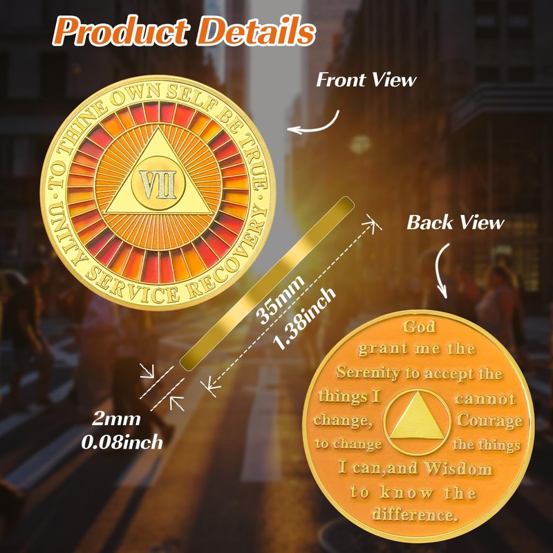 - Powerful Sobriety Design: This 7 year sobriety coin symbolizes an important milestone of one year in sobriety. The triangle on the AA Chip with the inscription “TO THINE OWN SELF BE TRUE” reminds us to maintain self-honesty and uphold AA values. The vibrant colors of this sober coin are a reflection of the hope and positive attitude of our sobriety process. Elegant and durable, this AA (NA) coin is the perfect sobriety gift to celebrate sobriety milestones and move on