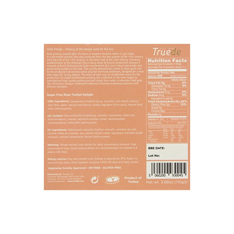 - HALAL & KOSHER APPROVED - Truede No added Sugar Rose Turkish Delight are Halal & Kosher approved, they contain no gelatine & are alcohol free