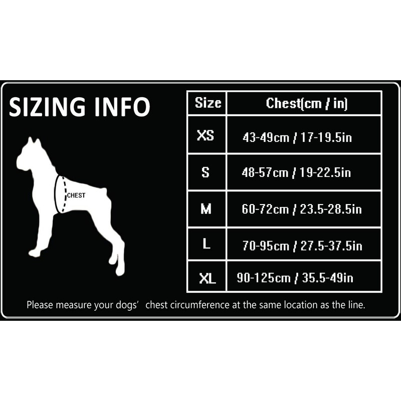 It's very important to find the right size:Measure your dog's width/girth by wrapping a tape measure around your dog's chest,just behind the front legs.Use the size chart to find correct sizing.