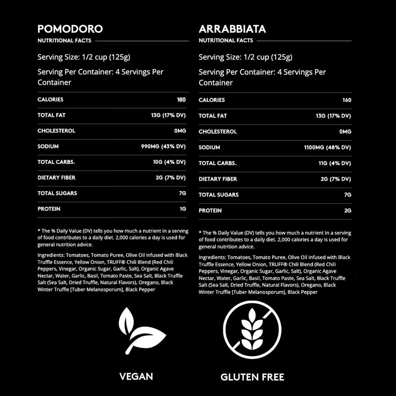 • Your New Pantry Staple. No more boring, bland and under seasoned jarred sauce. With TRUFF, pasta sauce has been reimagined, and we landed on the next big, delicious breakthrough that you’ll always want to keep in stock. Each bundle comes with two jars: Black Truffle Pomodoro, and its spicy counterpart Black Truffle Arrabbiata.