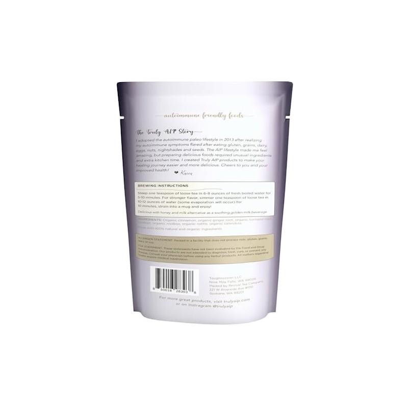 Feel your worries melt away as you relax with a cup of our aromatic and flavorful herbal tea that is AIP friendly!Regular self-care rituals like relaxing with a cup of tea are essential for all of us.Our teas aren't just a one-time experience; they're a lifestyle.We're deeply committed to the health of our customers, and we see it as our privilege to provide delicious, real food teas that include ingredients known to be good for you.They can be part of any protocol that works best for you and your individual dietary needs, whether that is AIP, Paleo, or a ketogenic lifestyle.Choose Loose Leaf Or Tea Bags C Each blend comes in loose leaf or tea bags, and we left out the sweetener so you can have your tea just the way you like it - unsweetened, or with any sweetener or milk of your choice.The Truly AIP Tea Story C Truly AIP Teas were created to provide a delicious substitute for the warm, comforting beverages from your previous life, before black pepper and other seeds became a nutritional nemesis!Our blend leaves out problematic ingredients, including both artificial and natural flavors, so that all you get is a delicious beverage brewed from real food ingredients.All those ingredients are sourced from a farm, not a lab.30-Day Money Back Guarantee C We're confident that you'll fall head over heels in love with our teas, but if for any reason you are unsatisfied, we promise a 30-day money back guarantee.Your satisfaction is our priority.