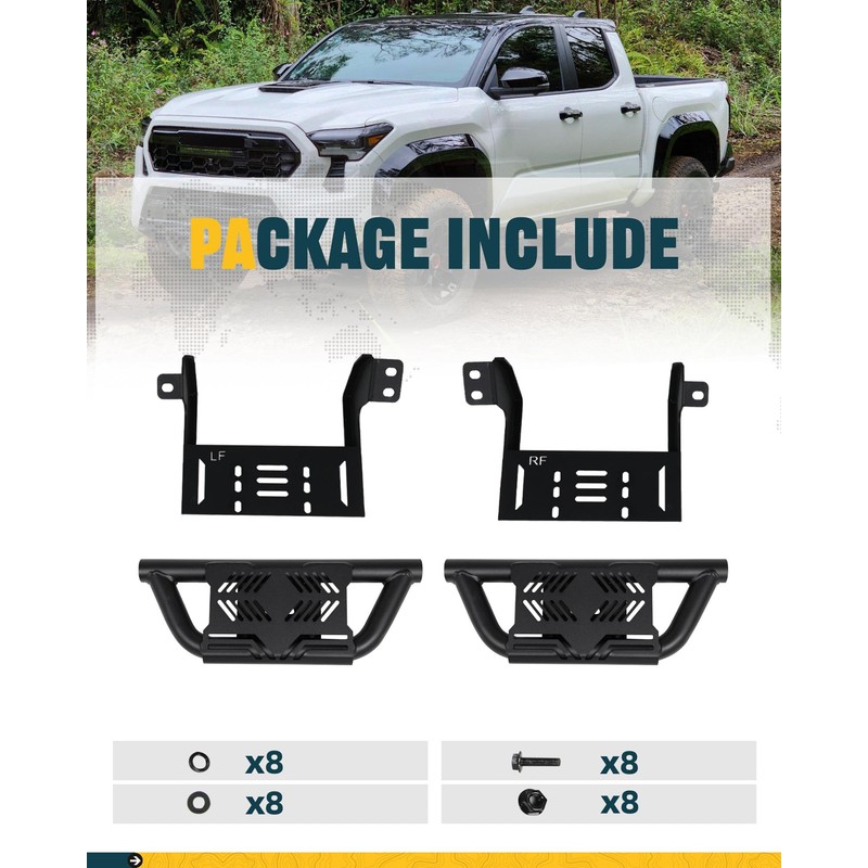 - ENHANCED ACCESSIBILITY: Elevate your off-road experience with our heavy-duty running boards specially designed for Toyota Tacoma 2024 2025 Front Doors Double Cab/Xtra Cab SR SR5 TRD PreRunner TRD Sport TRD Off-road Limited TRD Pro (Also for i-FORCE MAX). Effortlessly access your vehicle without sacrificing ground clearance.