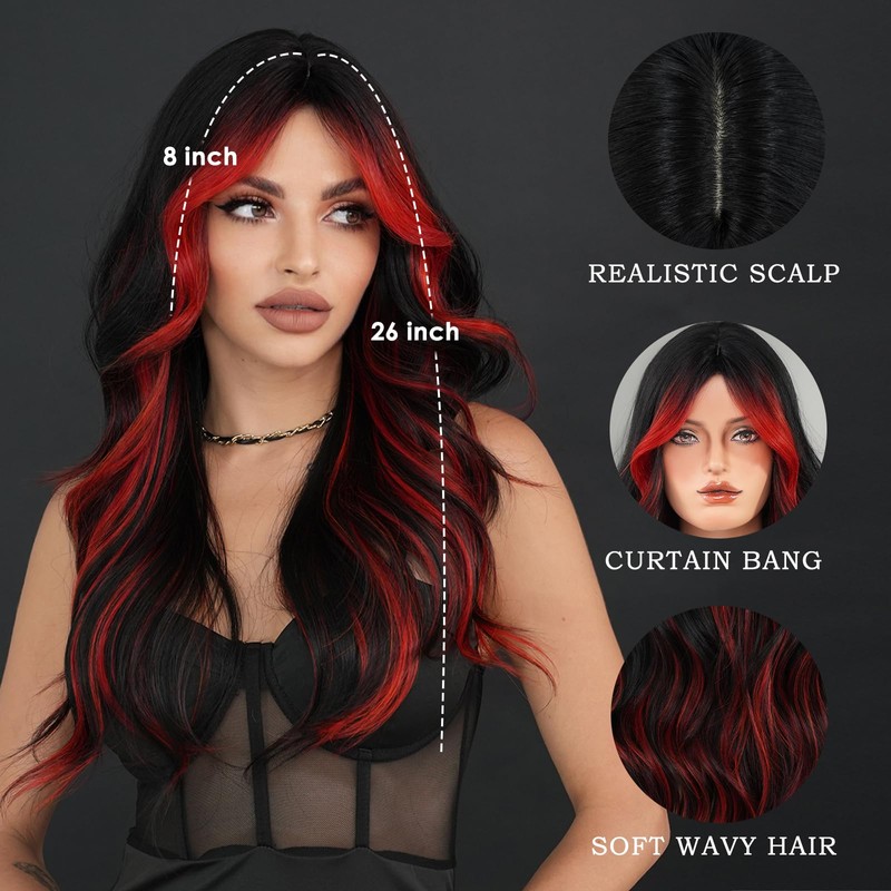 TRUMOST TRUMOST Black Red Highlight Long Wavy Wig with Curtain Bang 26 Inch Red Black Ombre Synthetic Heat Resistant with Dark Root Wig for Women Daily Party used.