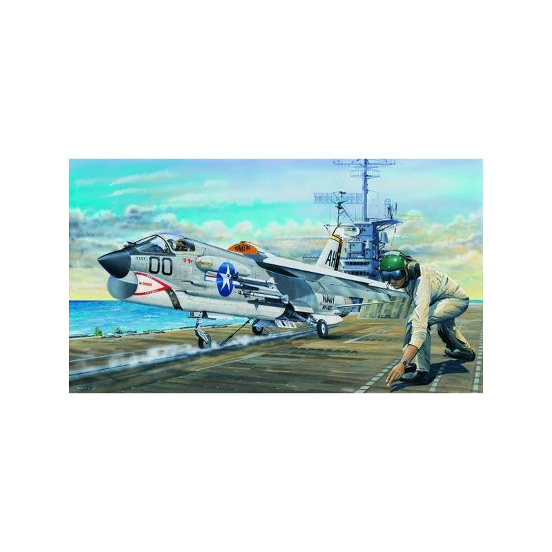 The F-8 Crusader was one of the first true supersonic carrier-based fighter aircrafts to be developed. In 1952, the US Navy was modernizing its carrier fighter force. From all the proposals, the new F-8 Crusader stood out and won the competition, it's maiden flight taking place on March 25th 1955. The design of the F-8 was unique in that the pitch of the entire wing could be adjusted in flight to allow for a proper angle of approach at low speeds. This plastic model kit is an accurate representation of the military vehicle.