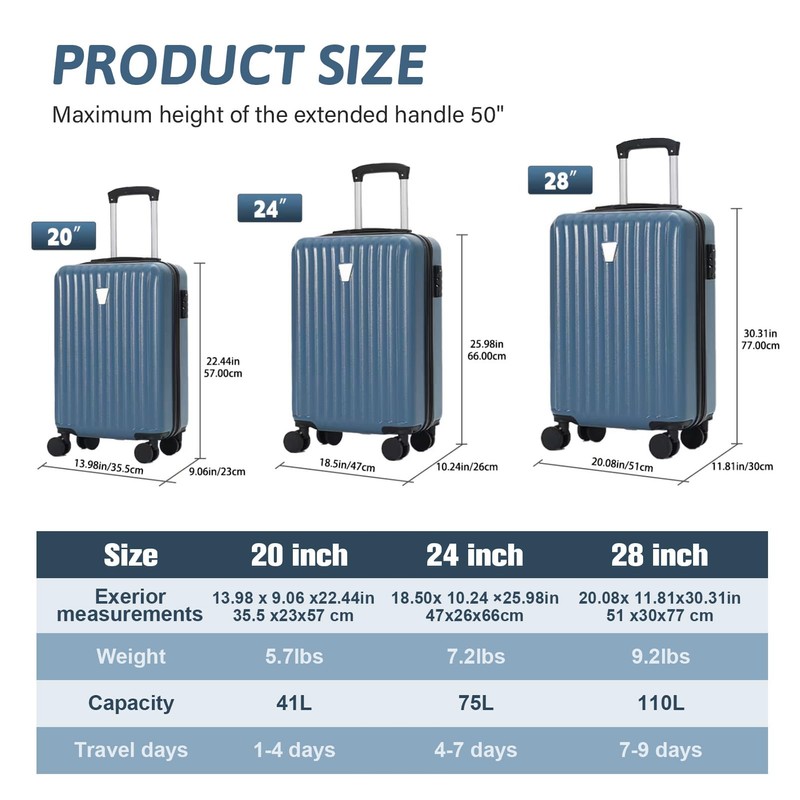 - Versatile 3-Piece Set: Includes 20” (carry-on), 24”, and 28” suitcases—ideal for short getaways, international trips, or as durable luggage for men and women.