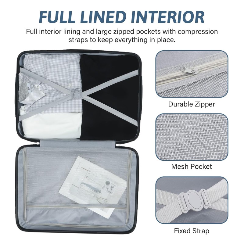 - Spacious Carry-On Luggage Set: Crossed straps + mesh pockets organize clothes and valuables; low-profile handles ensure easy lifting for business trips or family vacations.