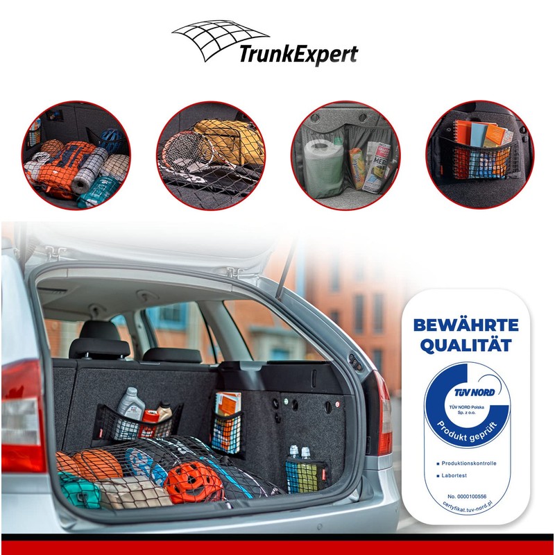 Easy installation without tools thanks to self-adhesive Velcro fastener - the net is glued to the boot, the boot carpet (felt material, etc.). Can be removed and reapplied. Ideal for storing tools, fire extinguishers, warning triangle and other accessories. Durable and stain resistant. Choice of different greetings and models in other offers from us.