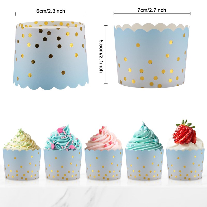 TRUSBER Cupcake Liners for Baking, Blue and Gold Polka Dots Muffin Paper Liners for Baby Shower, Birthday Party SPECIFICATIONS: Materials: Food-grade Greaseproof Paper Color: blue with gold dot Size: 2.7*2.3*2.1”(Top*Bottom*High) PACKAGE INCLUDES: Polka Dots Baking Cup * 50pcs Blue polka dot colorful baking cups will come in handy for every special occasion all year long - Best choice to enhance your Birthday, Wedding, baby shower.