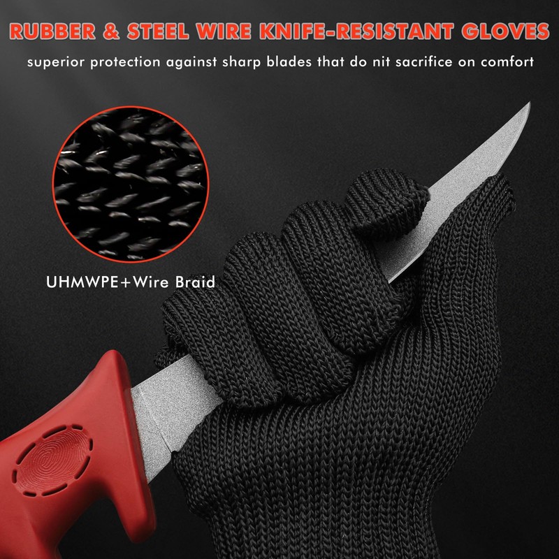 - Inside the set we also have a cut resistant glove made of polyester, metal as well as rubber. Perfect for any job that requires precision and gives you the best protection for your hands. For convenient and safe storage, this knife also includes a custom synthetic sheath.