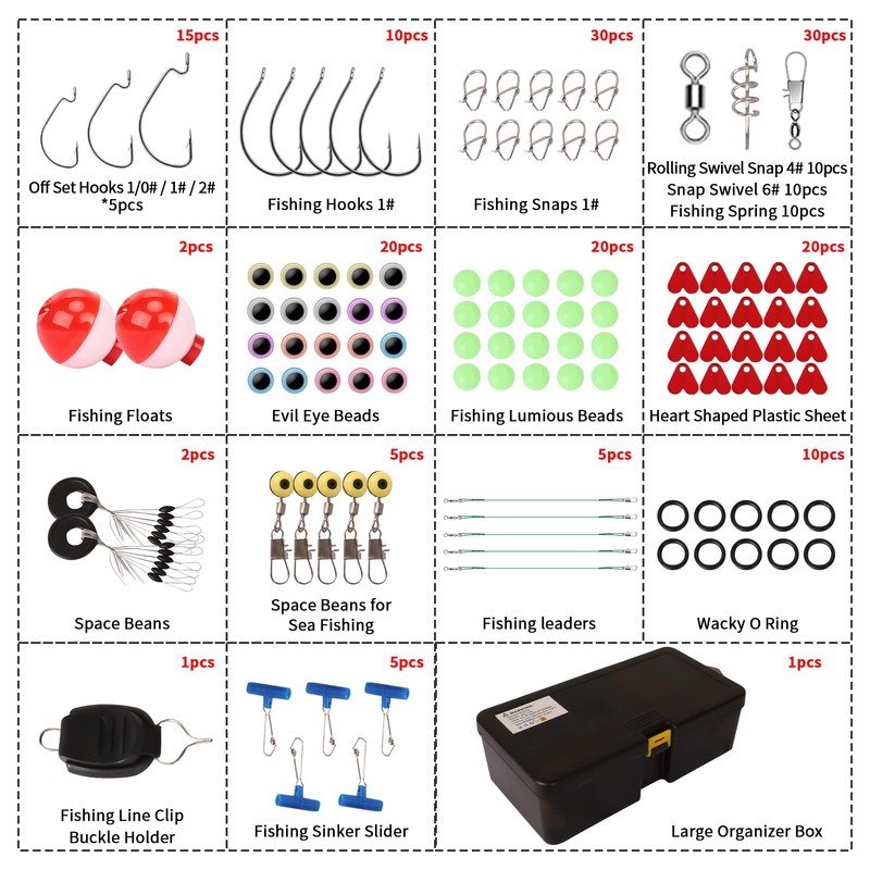 - Variety of Lures Combination - The 340 pieces fishing baits set comes with everything you need: 1pcs Jointed Swimbait, 1pcs Crankbait, 1pcs Popper, 1pcs Pencil, 1pcs Minnow, 1pcs VIB, 1pcs Frog Lure, 2pcs Spinner Lures, 6pcs Spoon Lures, 129pcs various Soft Lures, 40pcs Fishing Beads, 25pcs Fishing Hooks, 15pcs Jigs Heads, 6pcs Fishing Weights, 5pcs Fishing Leaders and other fishing accessories and more fishing gear, reliable and all-around choice for any angler and fishing enthusiast.