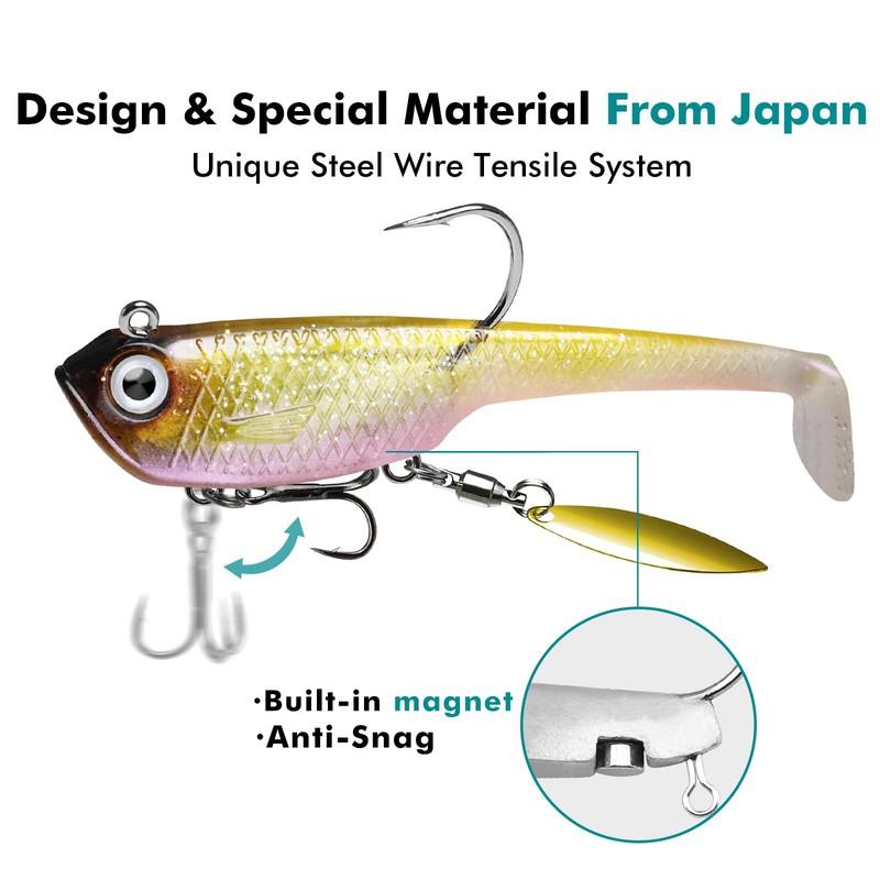 - UNIQUE DESIGN - 3D t-shaped soft tail with 360° spinner blade can kicks and thumps even at slow speeds. A super-lifelike soft jerkbait whose lively design perfectly emulates erratic baitfish action.