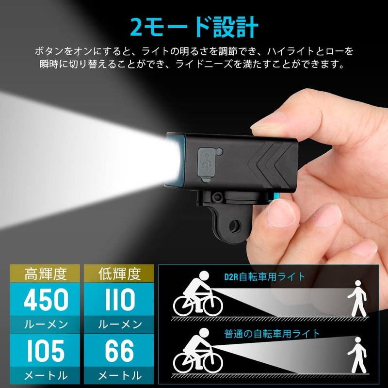 - 2 Speed Switch + 1 Strobe Mode: The D2R bike light has 2 levels of brightness, a large 155 degree flood spot design, and a burst flash mode. The maximum reach distance is 105 meters and the maximum luminous flux value is 450 lm