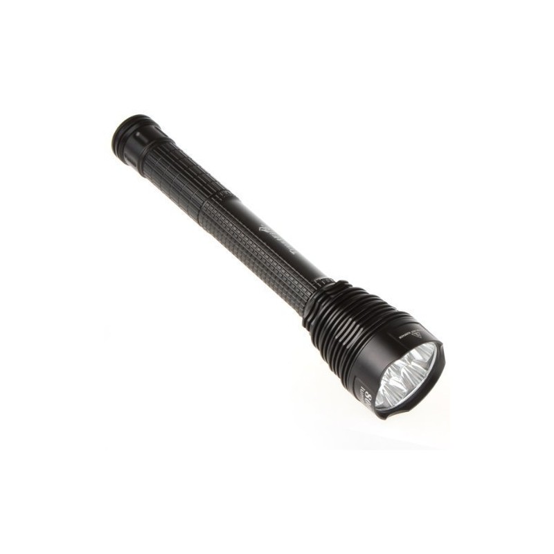 CREE XM-L T6 x 7 LED/ 8,000 Lumens (Manufacturer's Nominal Value) / 5 modes switching (High, Mid, Lo, Strobe, SOS) - Material: Aluminum alloy; Size: 12.2 x 2.5 inches (310 x 63 mm); Weight: 16.9 oz (456 g); Accessories: TrustFire holster, 18650 wearing adapter