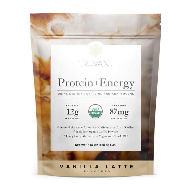 Truvani Protein + Energy Drink Mix with 87mg Caffeine | 12g Protein | Vanilla Latte | 20 Servings | USDA Organic Coffee Powder & Adaptogens | Vegan, Dairy & Gluten-Free, Non-GMO