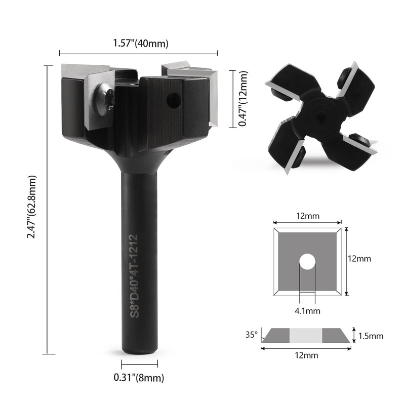 - Planer cutter for router. Specification: face milling cutter wood has a shank: 5/16 inch (8 mm). Diameter: 1.58 inch (40 mm). Total length: 2.47 inch (62.8 mm). Body material: hard carbon steel. Reversible plates: 12 x 12 x 1.5 mm, 35°. The matching reversible plates are sold under the ASIN "B0CKXFHJNC / B0CKXFSJFY".