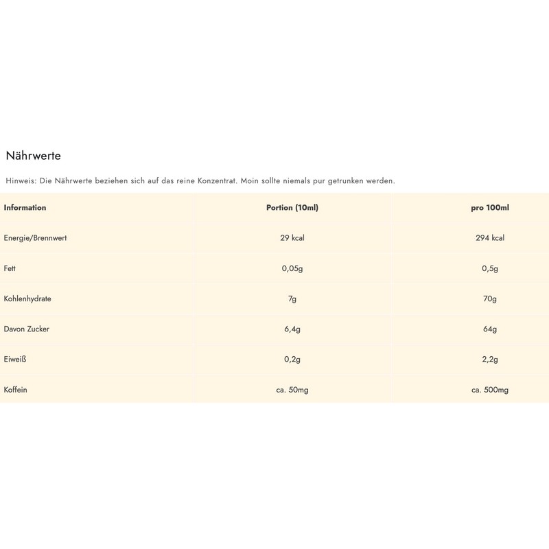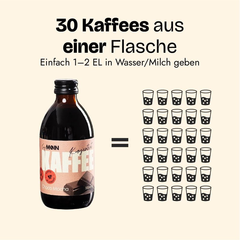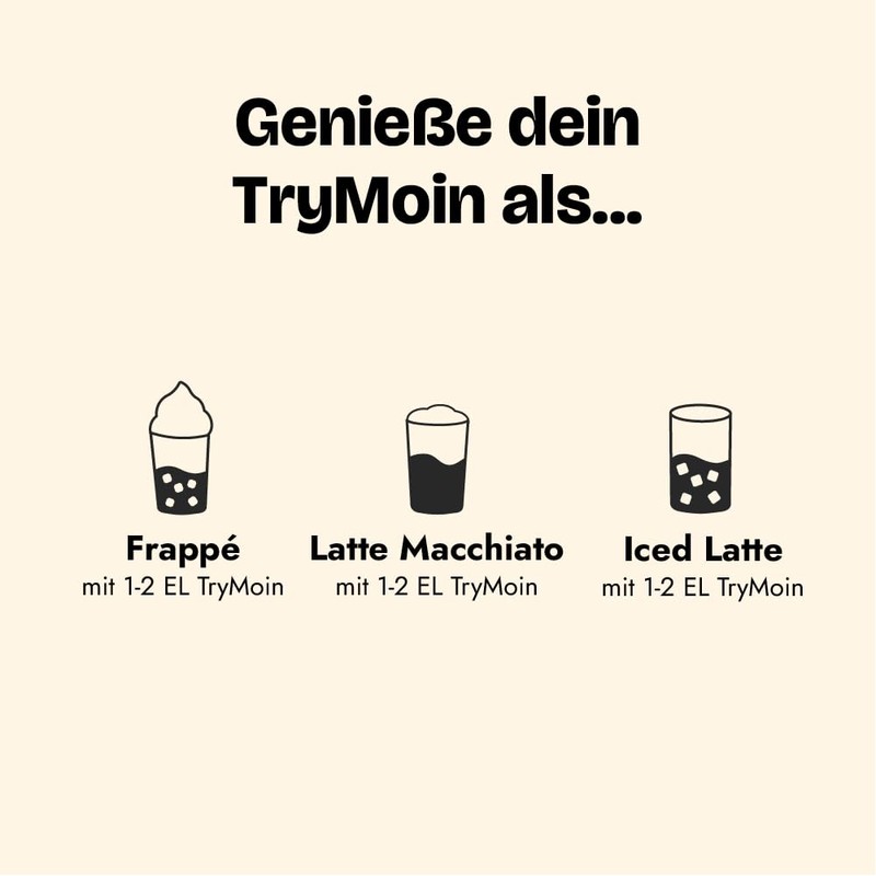 - Quick and easy preparation: With TryMoin you can enjoy your coffee in seconds, wherever and whenever you want. Simply add 1-2 tsp (pure) or 1-2 tablespoons (syrup variety) of TryMoin coffee concentrate to the glass, stir with warm or cold water or milk and enjoy immediately!