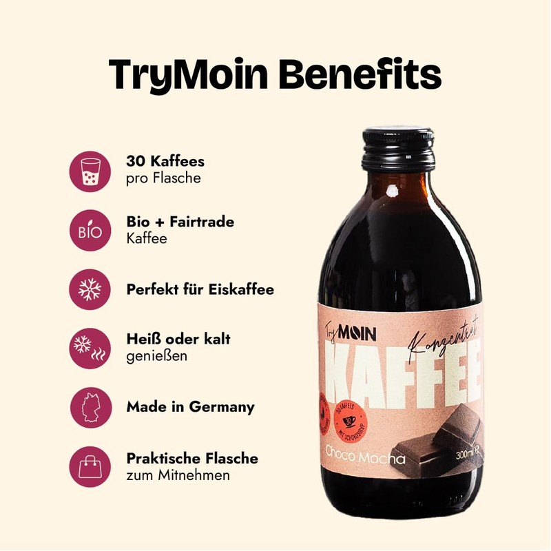 - TryMoin Coffee Revolution: Replace overpriced coffee from large coffee chains, unnecessary waiting for cooling when making iced coffee, and annoying cleaning of the coffee machine with TryMoin's unparalleled coffee enjoyment. Our mission: you can prepare any coffee creation faster, easier and at barista level with us!