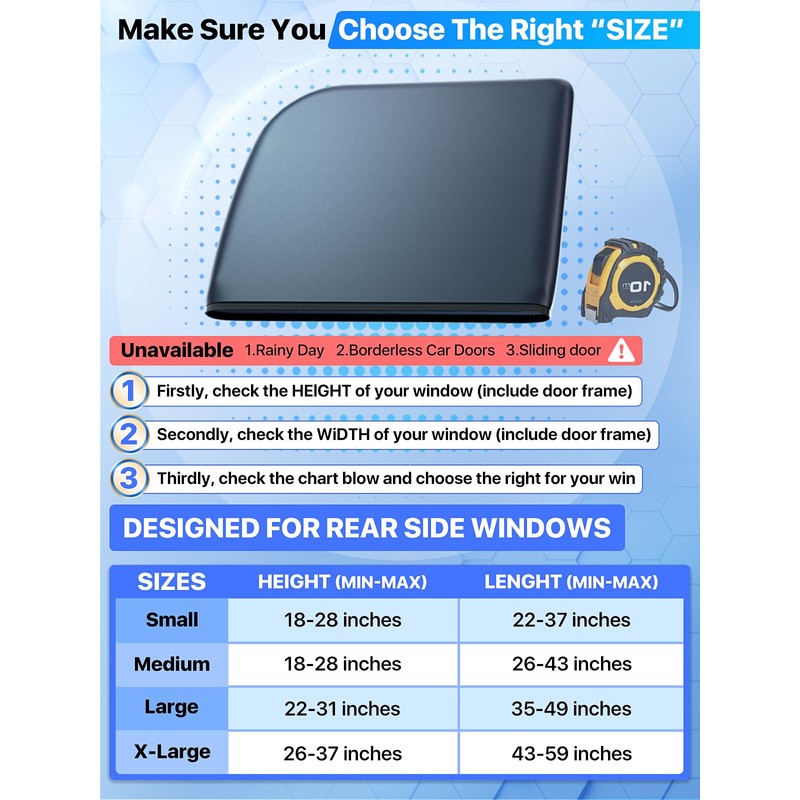 - [True Universal Fit + Size Guarantee] Engineered with stretch-resistant, high-elasticity fabric to fit windows from 26"–59" wide (covers 99% of vehicles). Choose from 3 sizes: Medium (26"-43"W x 18"-28"H), Large (35"-49"W x 22"-31"H), or X-Large (43"-59"W x 26"-37"H). Always measure your window frame before selecting.