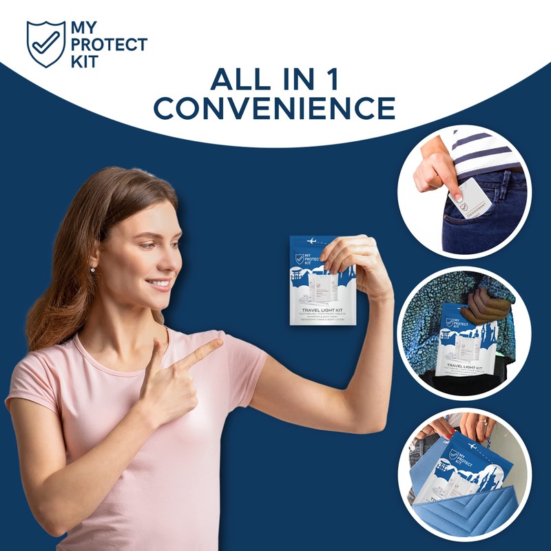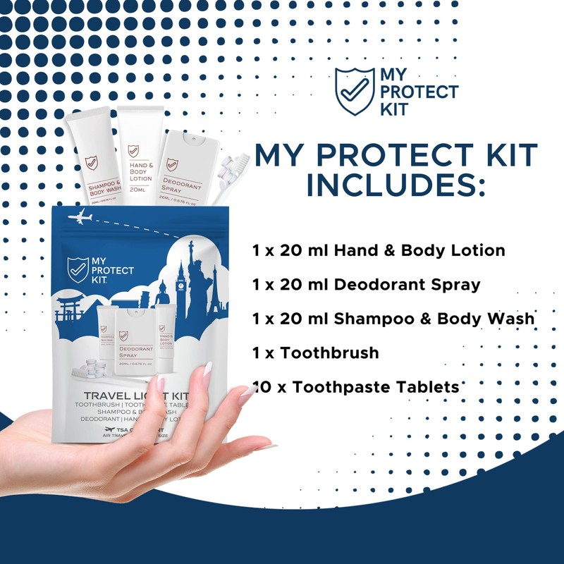 TSA Approved Travel Essentials for Men & Women - Hygiene Kit with Toiletries for Daily Use - Set includes Hand and Body Lotion, Deodorant, Shampoo, Toothbrush, and Toothpaste Tablets by My Protect Kit