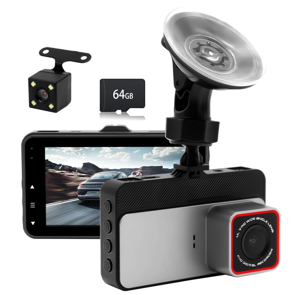 • 【3.0 inch HD Display】3.0 inch dash cam Compact design won't obstruct your vision. The front and rear camera simultaneously records not only forward collisions while driving, but also impact from the rear. (64GB flash memory included)
