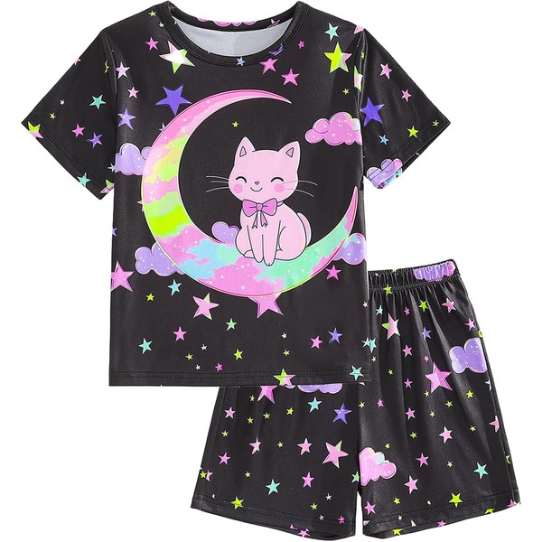 Tshyfiper Girls Pajamas Sets for Kids Cat Pjs Fluorescent Pajama Short Sleeve Top Star Lounge Shorts 3-7T (Black, 4-5T)