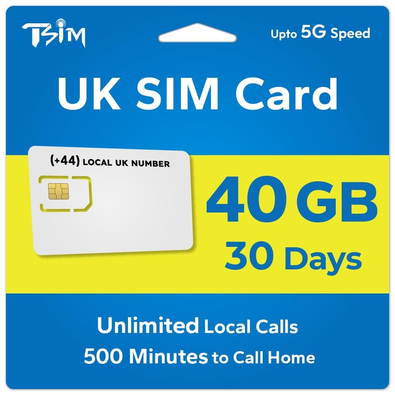 TSIM UK SIM Card for Canadian Traveler 30 Days | 40Gb Data + Unlimited Local Calls and Text + 500 Minutes to Call Home | Get Local UK Number Before Travel.