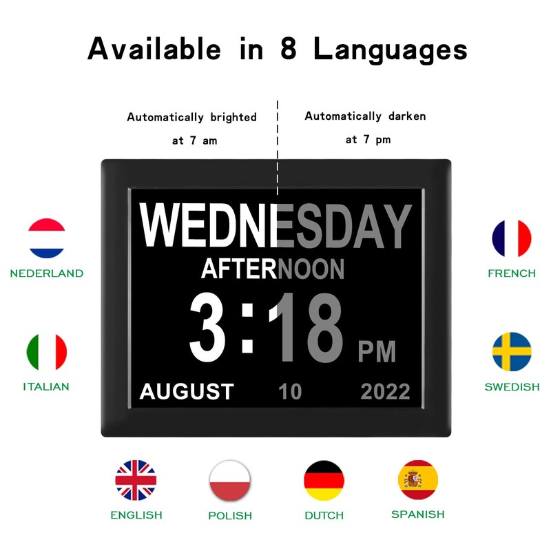 - 【AUTO DIMMER & 8 LANGUAGES】- Vision impaired clock dims every night at 7:00PM (10cd/M2) and brightens up during the day at 7:00 AM (50cd/M2); also can ADJUST BRIGHTNESS(level 1-10); Alzheimer clock with 8 Languages: English, French, Italian, Dutch, Spanish, Polish, Nederlands and Swedish.