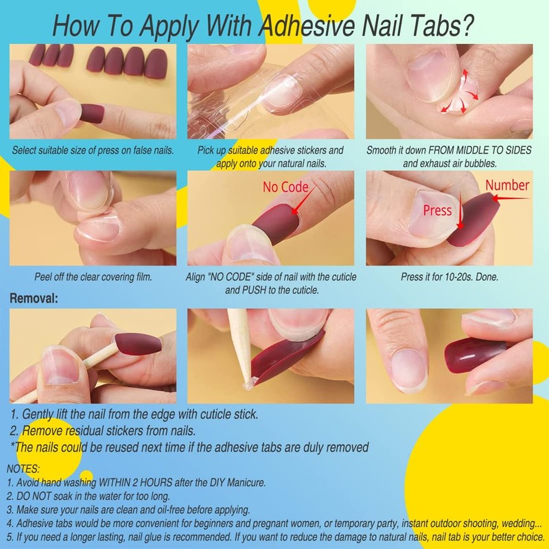 - Easy to use: trapezoidal design for easy selection and use. False nails are simply attached to the finger with double sided tape or glue. These false nails are designed to cover the nail perfectly and are very easy to apply and remove.