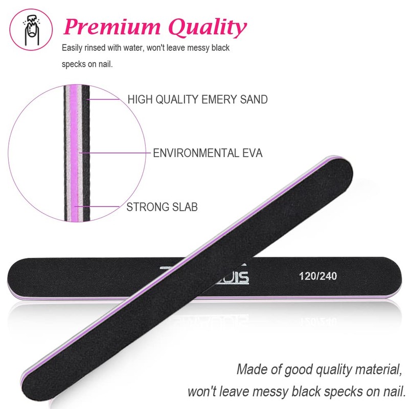 - Tablero de esmeril de doble cara: lima tus uñas naturales de dedos y uñas de los pies con grano 180, y utiliza grano 240 para suavizar el borde de tu uña con una forma refinada