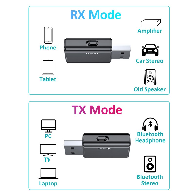 - BLUETOOTH TRANSMITTER RECEIVER: In TX mode, the USB Bluetooth transmitter allows you to stream audio from your PC, TV, tablet, MP3, MP4 player, and more to your Bluetooth headphones. In RX mode, the aux Bluetooth adapter enables you to send audio to car or home stereo via your smartphone and tablet.