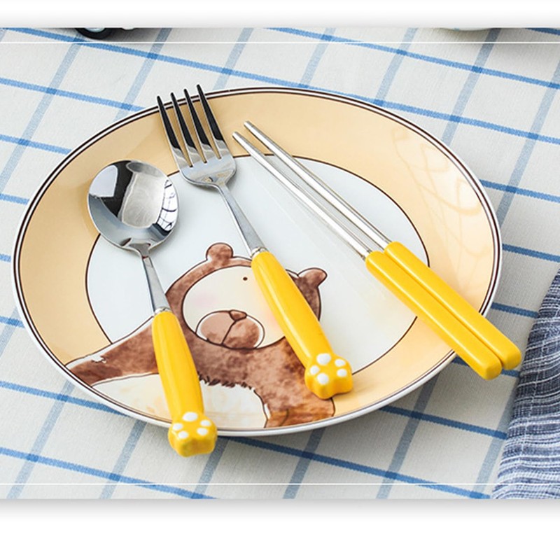 TSQIBU Tableware Spoon, Fork, Chopsticks, Spoon and Fork, Set of 3, Tableware Set with Storage Box, Lunch Box, Cute Cat Paw (yellow)