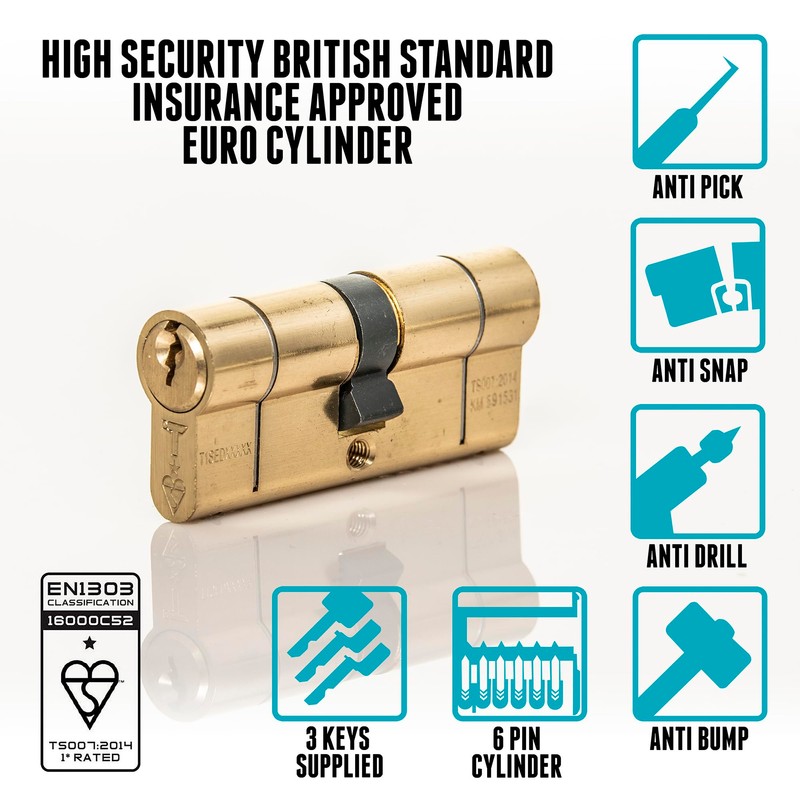 TSS Polished Brass High Security TS007 1 Star Euro Cylinder Lock, British Standard, Insurance Approved Barrel Lock and Key Sets. Supplied with 3 Keys. UPVC Door Locks. Brass (32mm x 40mm (72mm Total))