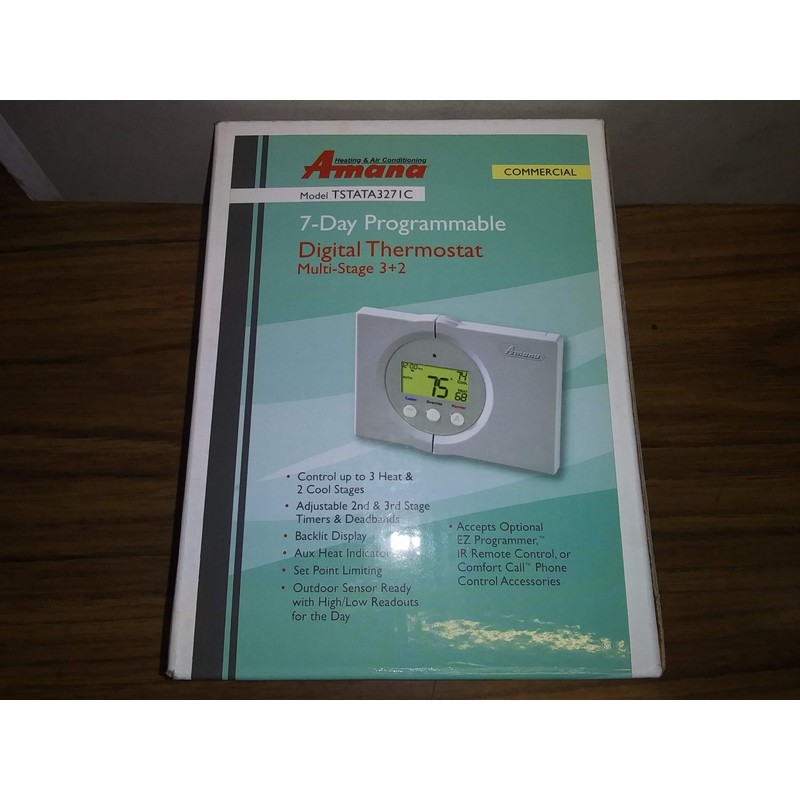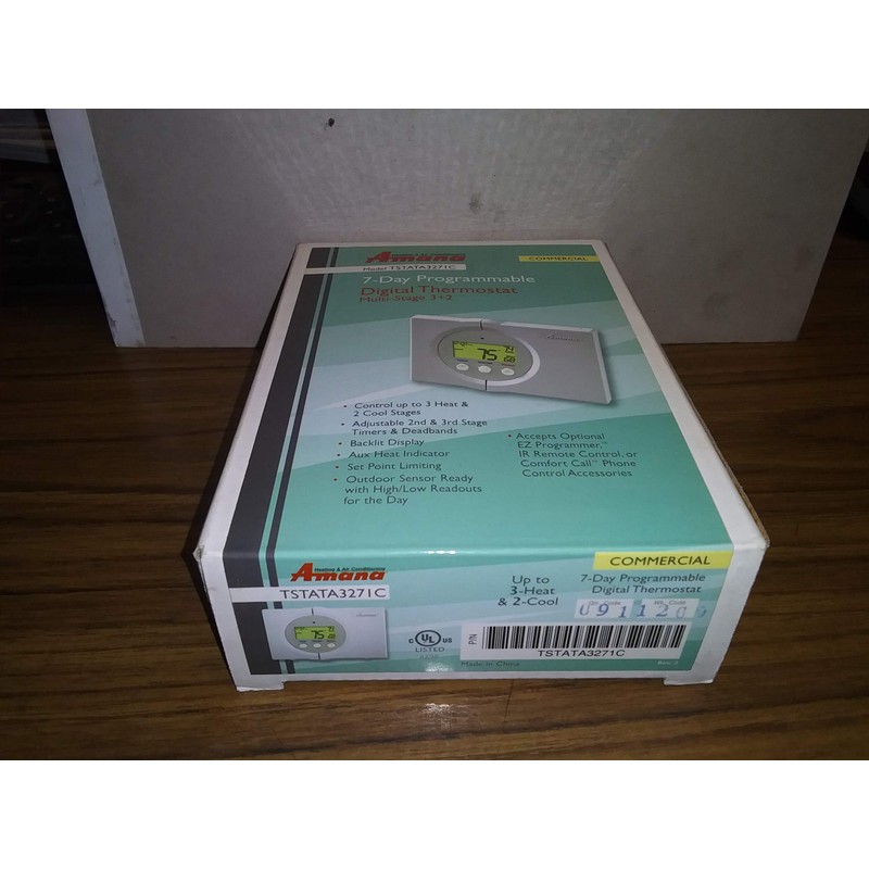 7-Day Programmable Digital Commercial Thermostat, Volts:24 VAC, Control Up To 3 Heat And 2 Cool Stages, Adjustable 2nd And 3rd Stage Timers And Deadbands, Backlit Display, Aux Heat Indicator, Set Point Limiting, Outdoor Sensor Ready With High/Low Readouts For The Day, Programmable Output, Accepts Optional Ez Programmer, Ir Remote Control Or Comfort Call Phone Control Accessories, Dims:4"H X 53/4"W X 11/16"D, Weight:10 Oz, In Mfg Box, Made In China.