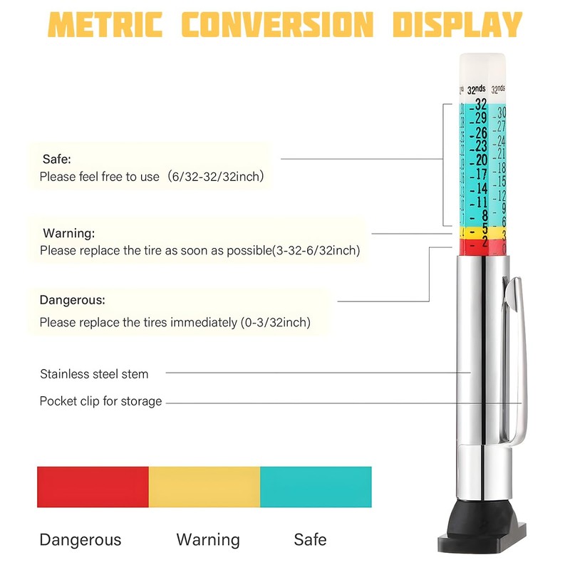 - Clear and Intuitive: The product is designed with a combination of color coding and clear numerical markings, making the readings easy to understand at a glance. The color coding visually shows the tire's wear stage through different colors, and with the precise scale of the cylindrical ruler, the measurement is more accurate. It allows you to read the data easily and conveniently.