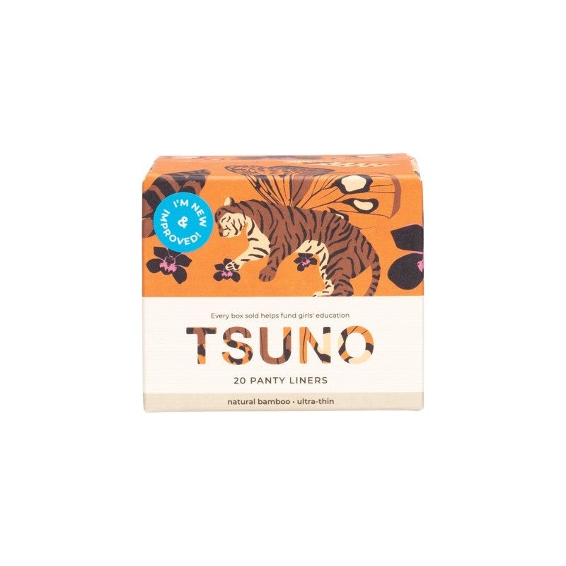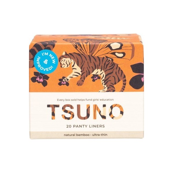 Tsuno's disposable, sustainable panty liners, made from a natural bamboo fiber top sheet and biodegradable bottom sheet, are individually wrapped in biodegradable sleeves and packaged in recyclable cardboard boxes. This 20 pack of panty liners are ultra-thin and suitable for everyday use.