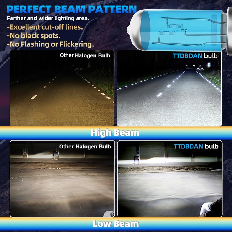 - 【300% Brighter & Power Saving】These Sentra headlight bulbs with new chips,luminous flux up to 1200 lumens per bulb.3 times brighter than original bulbs,6000k white perfect beam,excellent cut-off lines and perfect beam patterns.No black spots.No Flashing or Flickering.They also get a 80% power saving compared with original halogens.